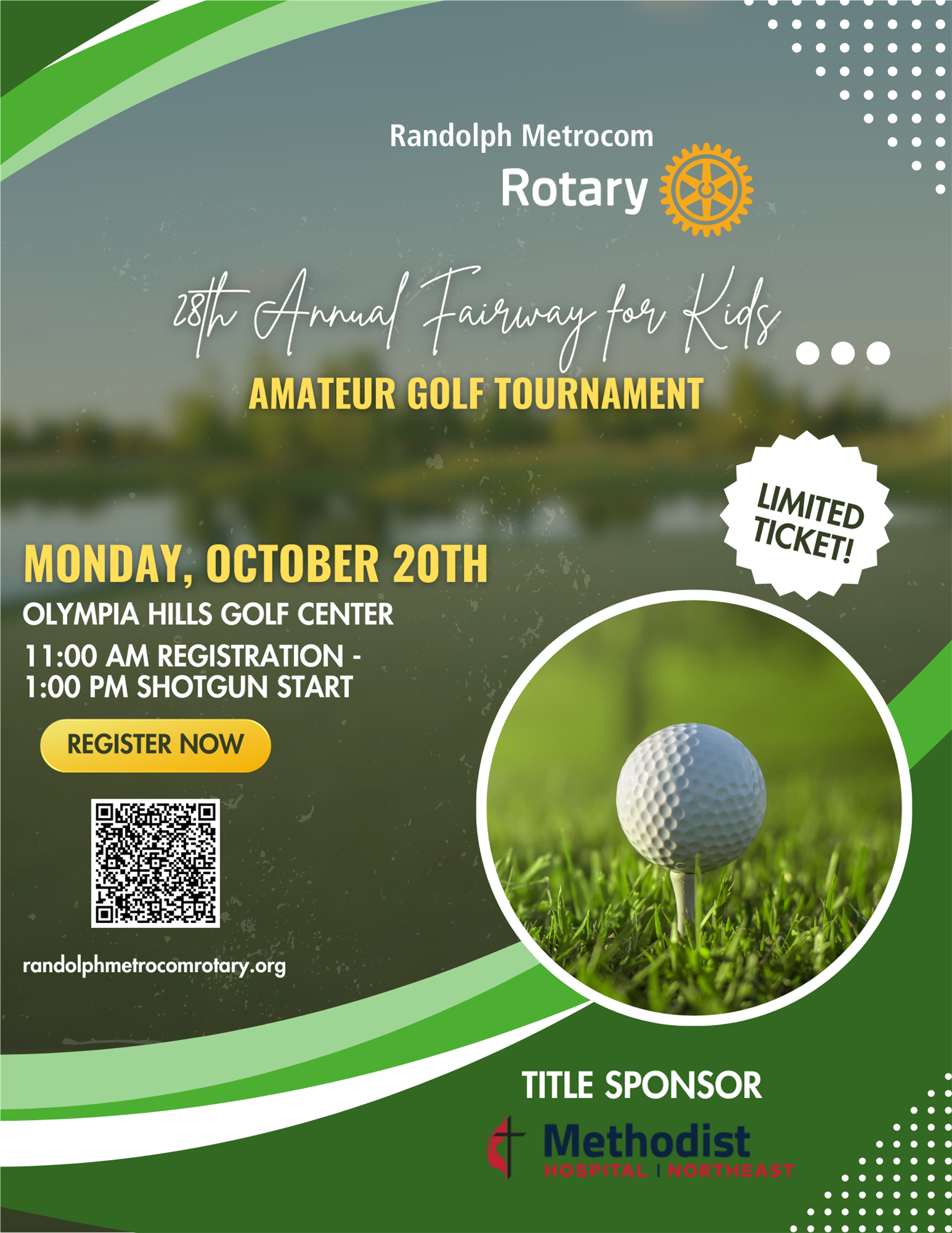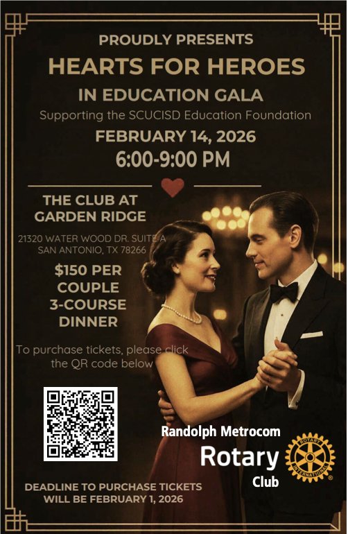 Business and Community Leaders working together for the betterment of their community. We meet the 2nd and the 4th Mondays from Noon to 1PM at the Olympia Hills Golf & Conference Center - located 12900 Mount Olympus in Universal City, Texas. Everyone is welcome to join us for lunch! Please RSVP to treasurer@randolphmetrocomrotary.org by 8PM the Friday before the luncheon.